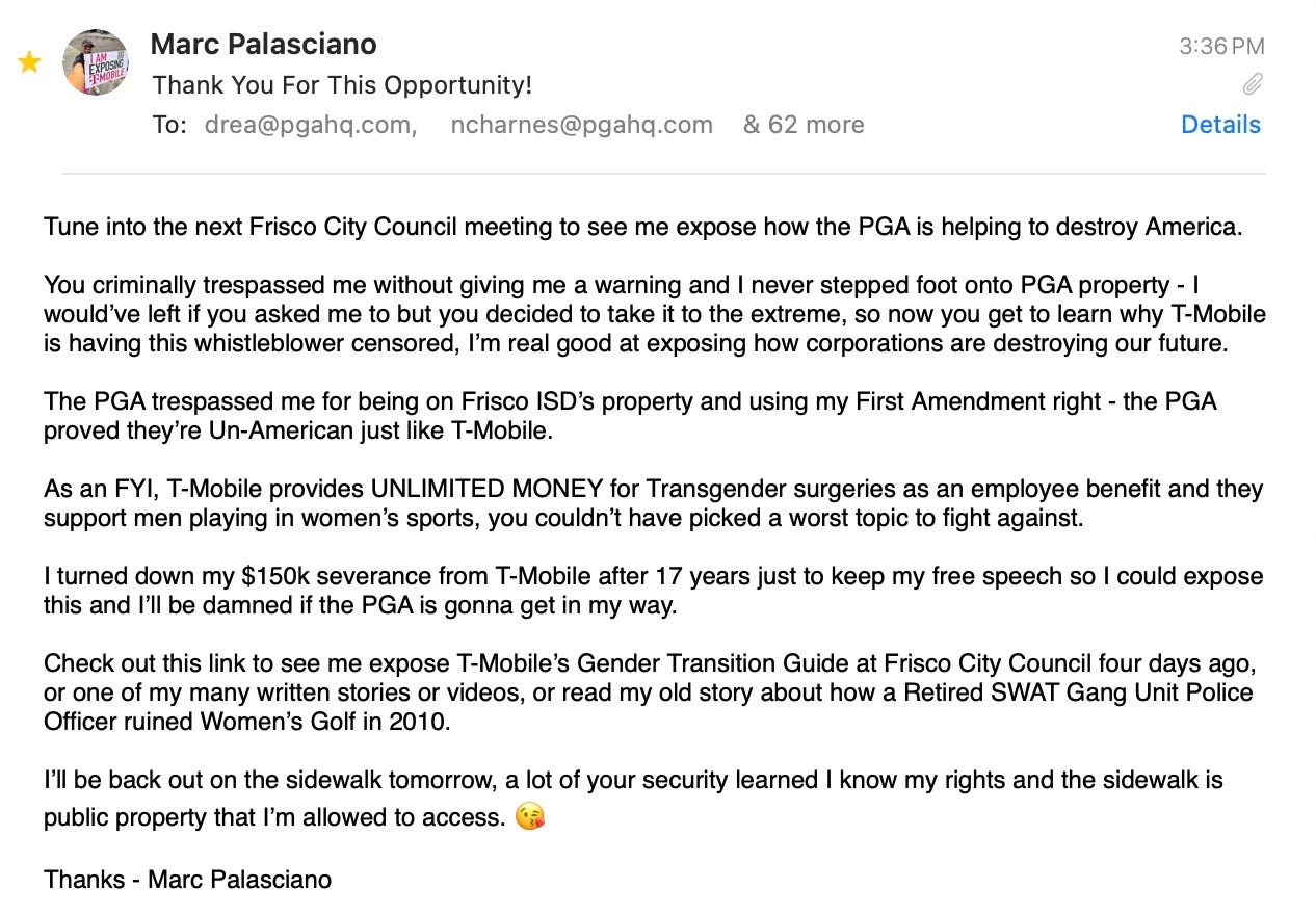 I emailed A LOT of people today - the PGA Tour Media, the Omni Hotel’s PR department, Executives at the PGA and PGA Tour, a lot of other random people I found on the PGAs website, and of course I added Frisco City Council. I left T-Mobile leadership off intentionally because I want them to hear about it from someone else this time.