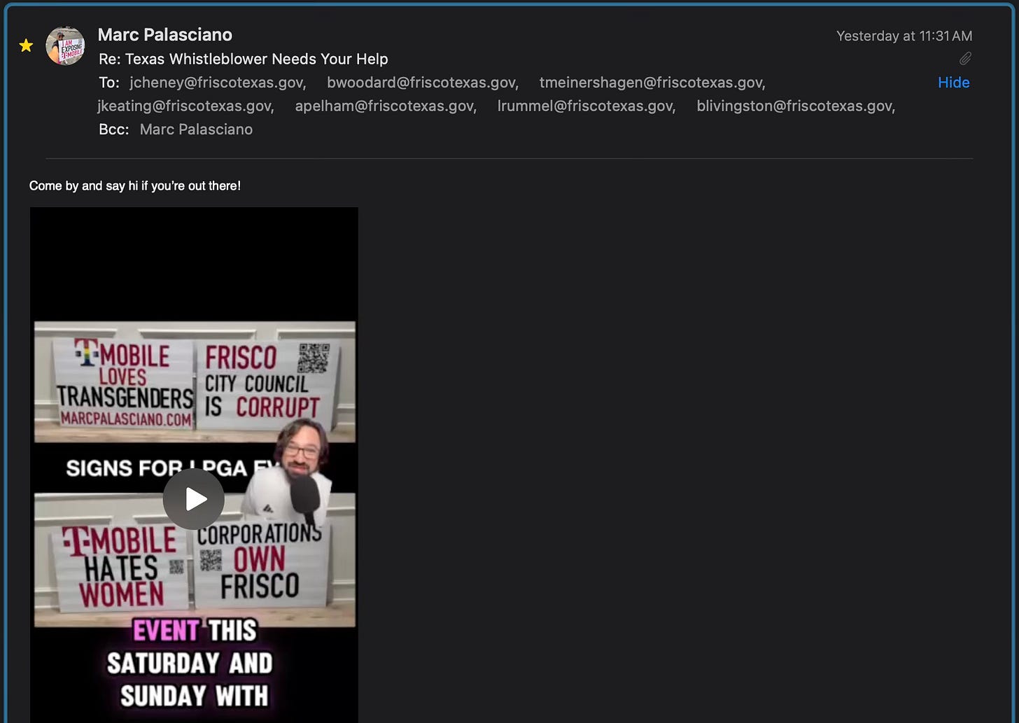 Everything I do is transparent and truthful and I’ve documented my story as a breadcrumb trail for anyone to read, I put out my own Be On The Lookout yesterday on all my social medias and I even emailed the Frisco City Council inviting them to come say hi.