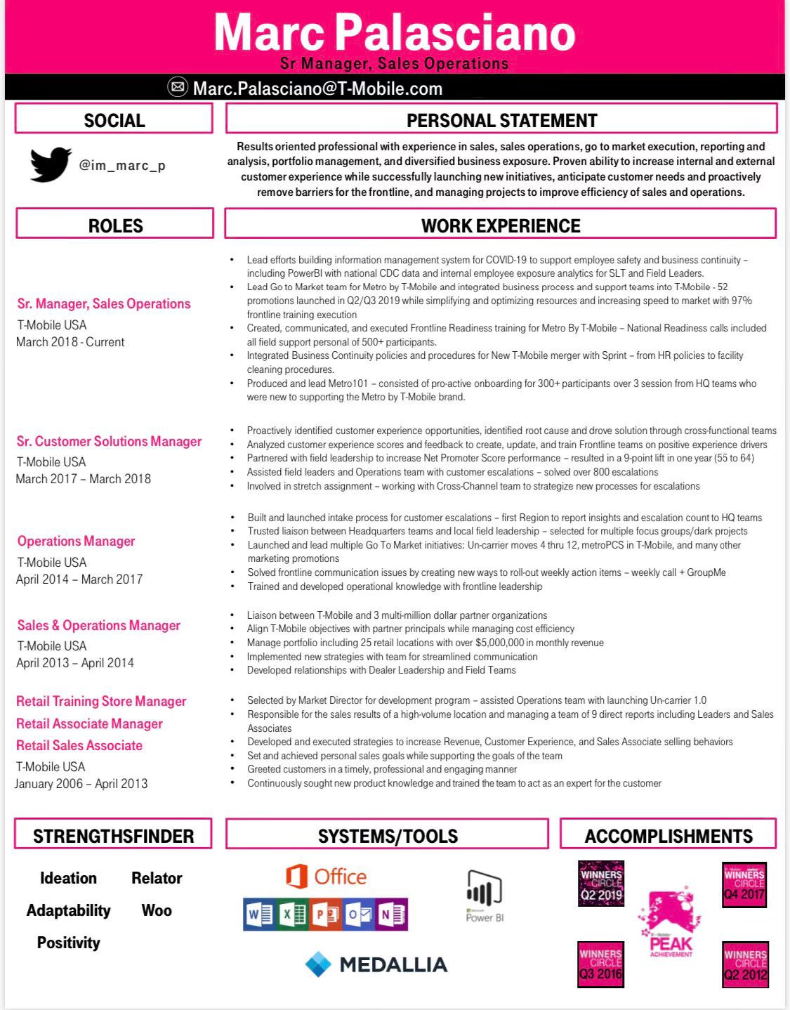 I’m gonna drop my resume here too, it’s not worth reading all of it, but I want you to understand the level of expertise I acquired at T-Mobile, because I was one of the best in the company and I was a jack of all trades with frontline experience. I started from the bottom as a Seasonal Sales Representative and worked my way up to a Sr Manager making $200k annually with a lot of PTO and benefits after 17 years of dedication, and then I requested to be laid off and turned down my $150k severance so I could talk about T-Mobile in my Independent Journalism.