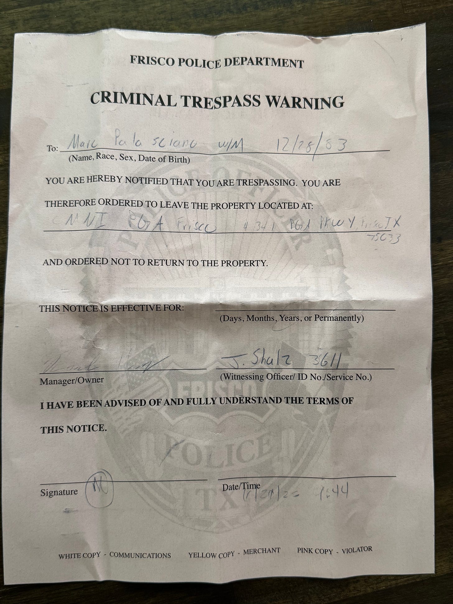 I identified this unique situation before I arrived. I knew not to go onto the PGA’s property, I figured they could control the High School parking lot I paid to park in, but I didn’t think I could receive an official Criminal Trespass Warning from the Frisco Police without ever stepping foot onto PGA property.