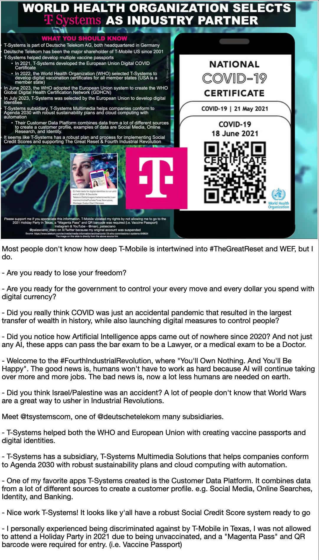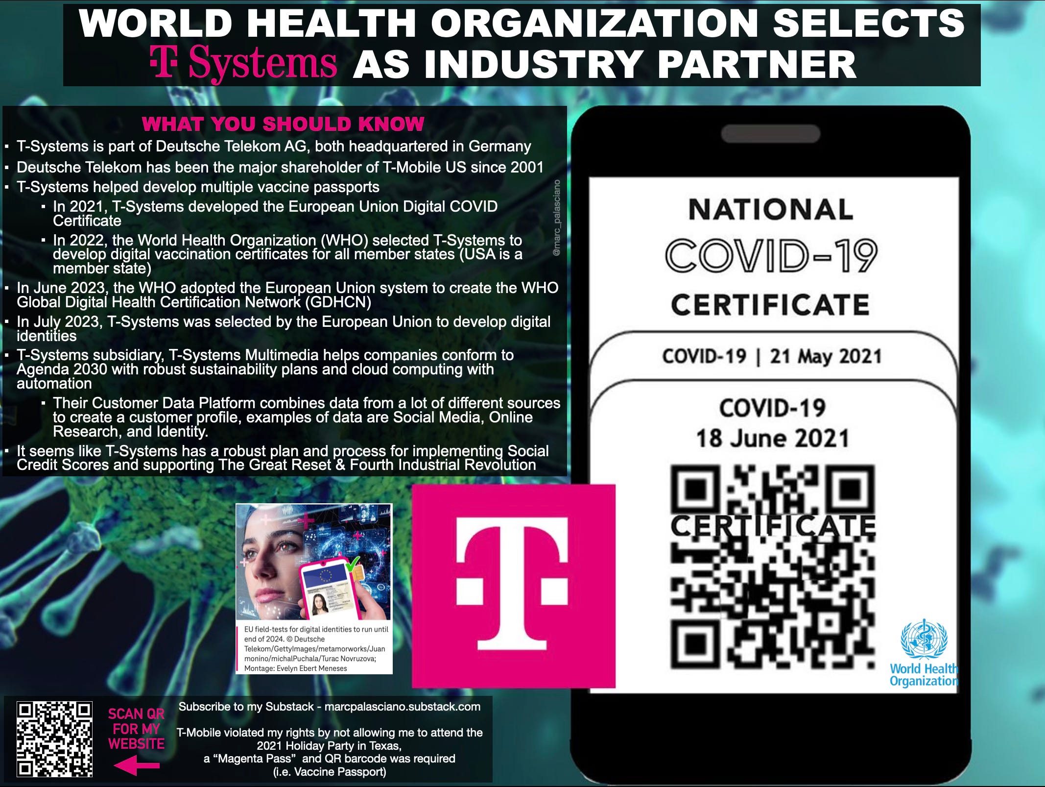 My Masterpiece exposed how T-Systems created the Vaccine Passports for the World Health Organization and European Union, T-Systems creating the Digital ID for the European Union, and T-Mobile having all the technology needed to enslave humanity in the World Economic Forum’s Fourth Industrial Revolution.