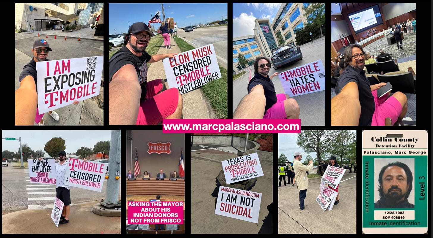 Undeterred, he took his fight to the streets, protesting outside T-Mobile offices with handmade signs and videos. But this escalated into legal persecution. In 2025, Marc was prosecuted by the State of Texas, which he accuses of colluding with T-Mobile to silence him. He spent 3.5 months in Collin County jail for what he calls “Weaponizing Free Speech and the First Amendment.”